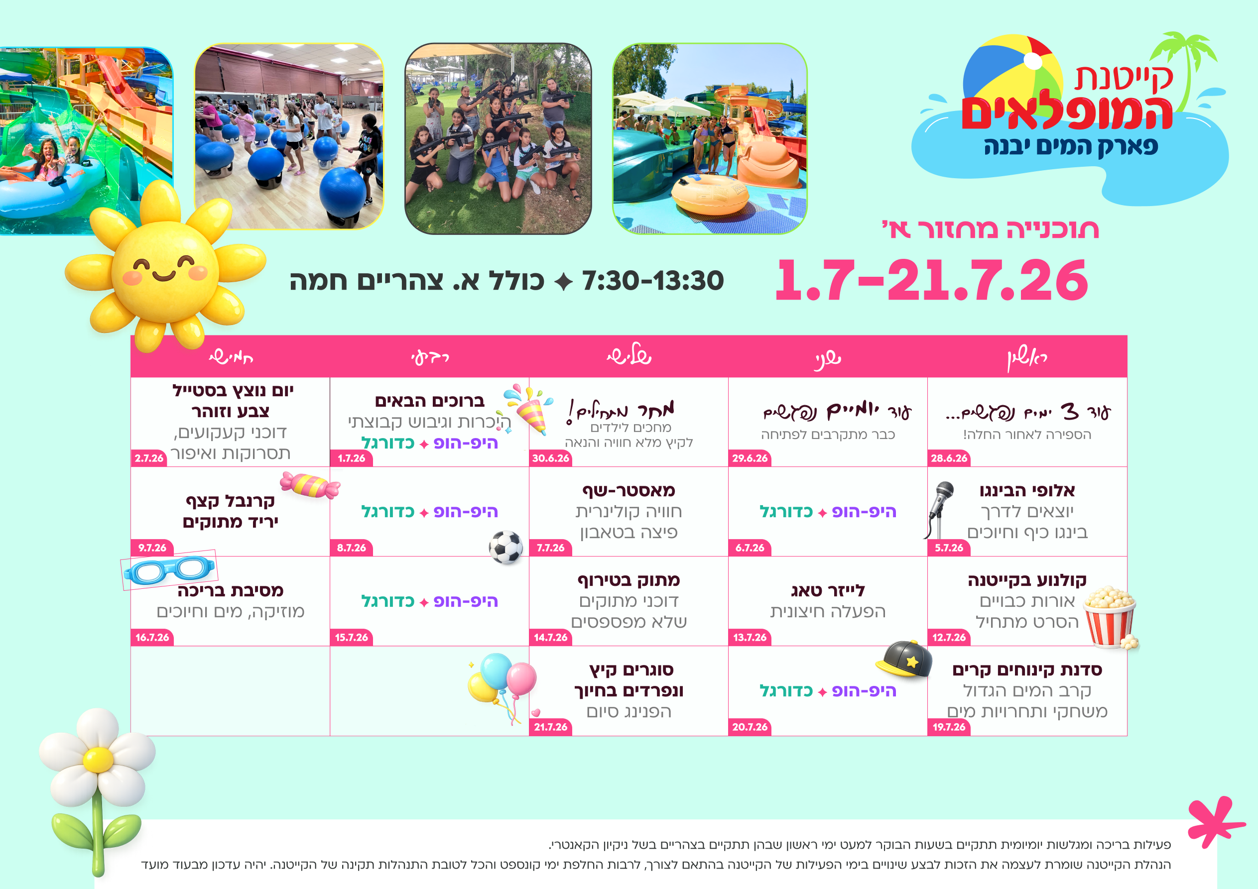 כבר 7 שנים שקייטנת המופלאים בפארק המים יבנה מביאה שילוב מושלם של חוויה, הנאה וספורט.
