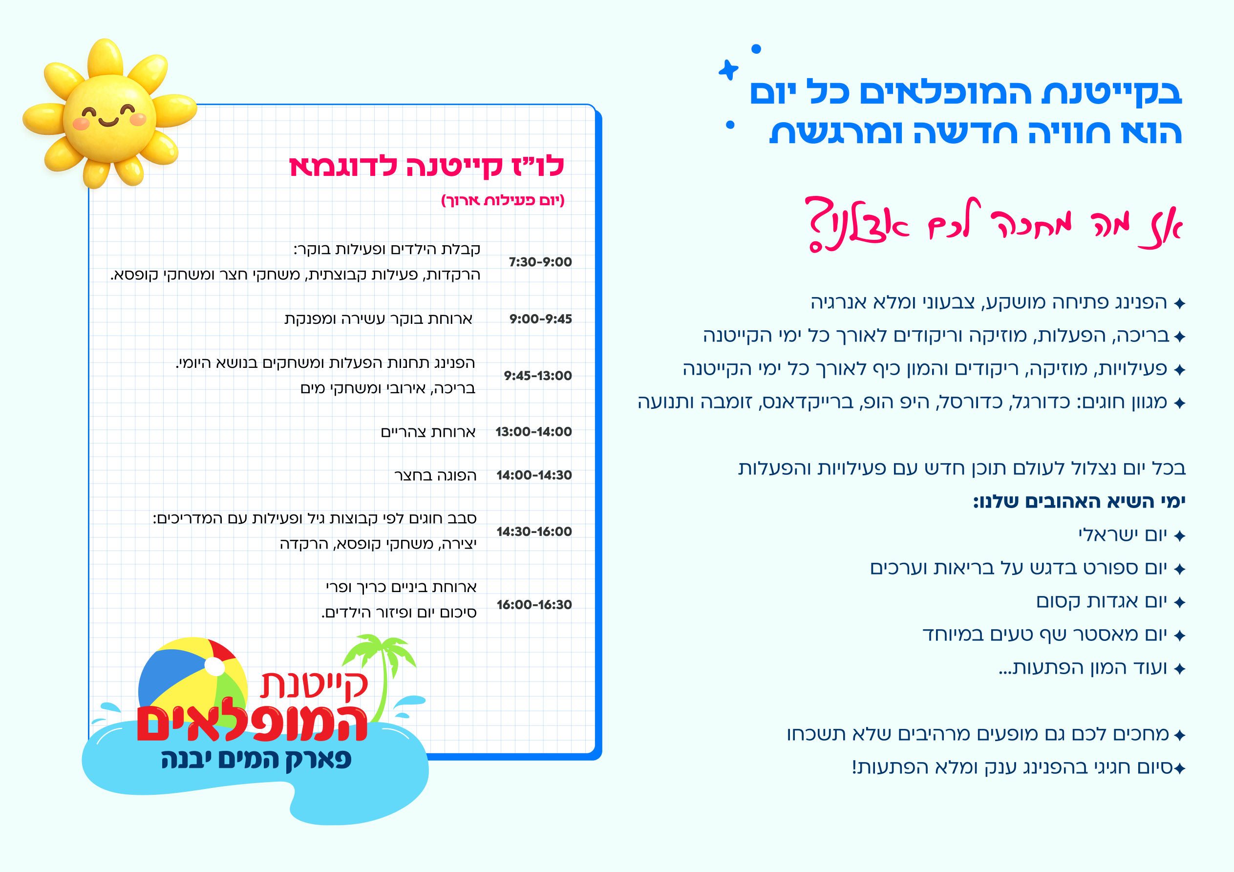 יחס אישי, צוות מקצועי, פעילויות מים וספורט המתאימות לילדים בגילאי 4–13.